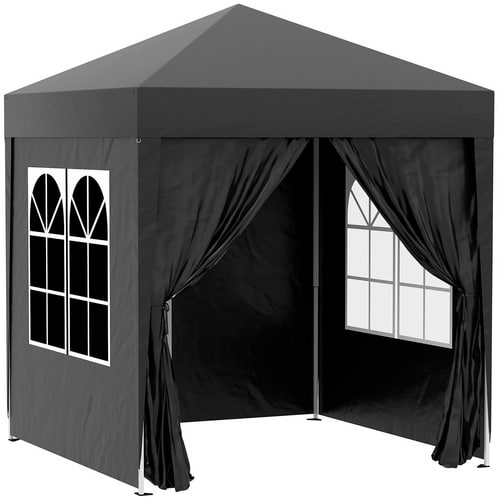 Schaffen Sie sich mit dem Outsunny Pavillon in elegantem Schwarz eine Wohlfühloase im Freien. Dieser kompakte Pavillon mit den Maßen 200 x 200 cm Grundfläche und einer Höhe von 245 cm ist die ideale Lösung für kleinere Terrassen, Balkone oder als zusätzlicher, charmanter Sitzbereich in Ihrem Garten. Er bietet zuverlässigen Schutz vor Sonneneinstrahlung und leichten Regenschauern und verwandelt jeden Außenbereich in einen gemütlichen Rückzugsort für entspannte Stunden allein, zu zweit oder mit Ihren Liebsten.