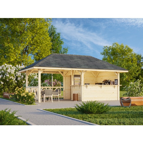 | Design-Merkmale | Klassische Pavillonform mit einem stabilen Dachkonstruktion. Die naturbelassene braune Farbgebung unterstreicht den rustikalen und gleichzeitig eleganten Charakter. Die großzügige Grundfläche von über 17 m² ermöglicht vielfältige Einrichtungskonzepte. Integrierte Elemente wie Pfosten und Dachsparren sind präzise gefertigt. |