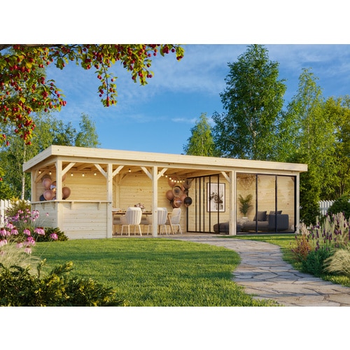 Der PALMAKO Pavillon »Lenna Set 415 Slide« überzeugt durch seine beeindruckenden Dimensionen und die durchdachte Bauweise. Die Angabe BxHxT: 876 x 245 x 300 cm verdeutlicht die großzügige Fläche, die Ihnen zur Verfügung steht. Diese Maße ermöglichen die Unterbringung von zahlreichen Sitzmöbeln und bieten ausreichend Platz für Ihre individuellen Gestaltungswünsche. Die transparente Tauchgrundierung im Farbton Braun unterstreicht die natürliche Schönheit des Holzes und schützt es gleichzeitig effektiv.