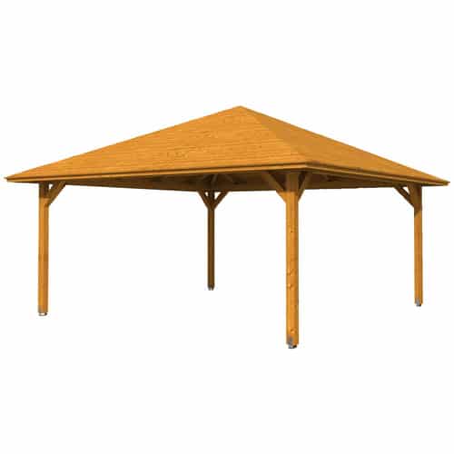 Der SKANHOLZ Pavillon »Cannes 4« besticht durch sein klassisches, viereckiges Design, das sich nahtlos in jede Gartenlandschaft integriert. Die symmetrische Form mit einer Seitenlänge von 569 cm und einer beeindruckenden Höhe von 360 cm schafft ein offenes und einladendes Ambiente. Die zentrale Überdachung in Form eines Zeltdaches sorgt nicht nur für einen optischen Höhepunkt, sondern ermöglicht auch eine effiziente Ableitung von Regenwasser und schützt gleichzeitig vor direkter Sonneneinstrahlung.