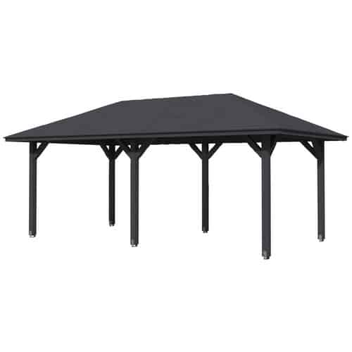 Der SKANHOLZ Pavillon »Orleans 1« besticht durch seine klare Linienführung und die durchdachte Konstruktion. Die viereckige Grundform mit den Maßen 374 x 314 cm (Breite x Tiefe) schafft eine großzügige Fläche, die Platz für verschiedene Nutzungsszenarien bietet. Die Gesamthöhe von 314 cm sorgt für ein angenehmes Raumgefühl und ausreichend Kopffreiheit, während die Tiefe von 656 cm, welche wahrscheinlich die Tiefe des integrierten Daches oder der seitlichen Überdachung meint, zusätzlichen Schutz und eine ansprechende Optik verleiht. Das charakteristische Zeltdach ist nicht nur optisch ein Hingucker, sondern erfüllt auch praktische Funktionen. Es leitet Regenwasser effizient ab und schafft eine attraktive Silhouette, die den Pavillon zu einem echten Blickfang in Ihrem Garten macht. Die Farbe Grau unterstreicht das moderne und zeitlose Design und fügt sich harmonisch in jede Umgebung ein.