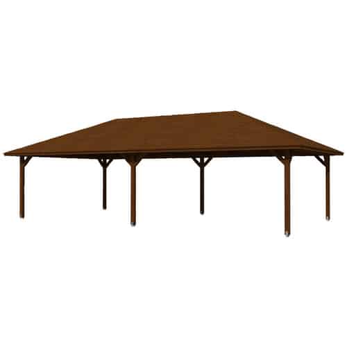 Typischerweise verwendet SKANHOLZ für seine Pavillons hochwertiges Massivholz wie Kiefer oder Fichte. Dieses Holz ist für seine natürliche Robustheit bekannt und wird für den Außeneinsatz speziell behandelt (z.B. durch Druckimprägnierung oder eine schützende Lasur), um seine Widerstandsfähigkeit zu erhöhen.