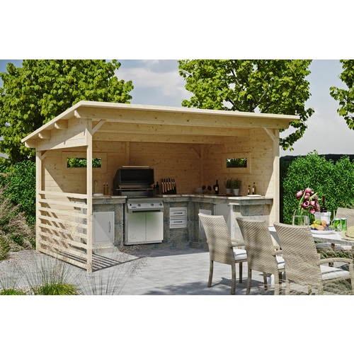 Das Design des SKANHOLZ Pavillon »Vimmerby« ist bewusst schlicht und zeitlos gehalten, um sich nahtlos in jede Umgebung einzufügen. Die klare Struktur und die natürlichen Holztöne schaffen eine warme und einladende Atmosphäre. Die großzügigen Abmessungen von 410 cm in der Breite und 310 cm in der Tiefe bieten ausreichend Platz, um Ihre Gartenmöbel unterzubringen und mehreren Personen bequem Platz zu bieten. Die Höhe von 244 cm gewährleistet eine angenehme Stehhöhe und ein offenes Raumgefühl. Die beige Oberflächenbehandlung verleiht dem Pavillon nicht nur eine ansprechende Optik, sondern schützt das Holz auch effektiv vor den Einflüssen des Wetters. Dies verlängert die Lebensdauer des Pavillons und reduziert den Wartungsaufwand. Das nordische Fichtenholz, das für seine Robustheit und Langlebigkeit bekannt ist, wird in diesem Pavillon optimal zur Geltung gebracht.